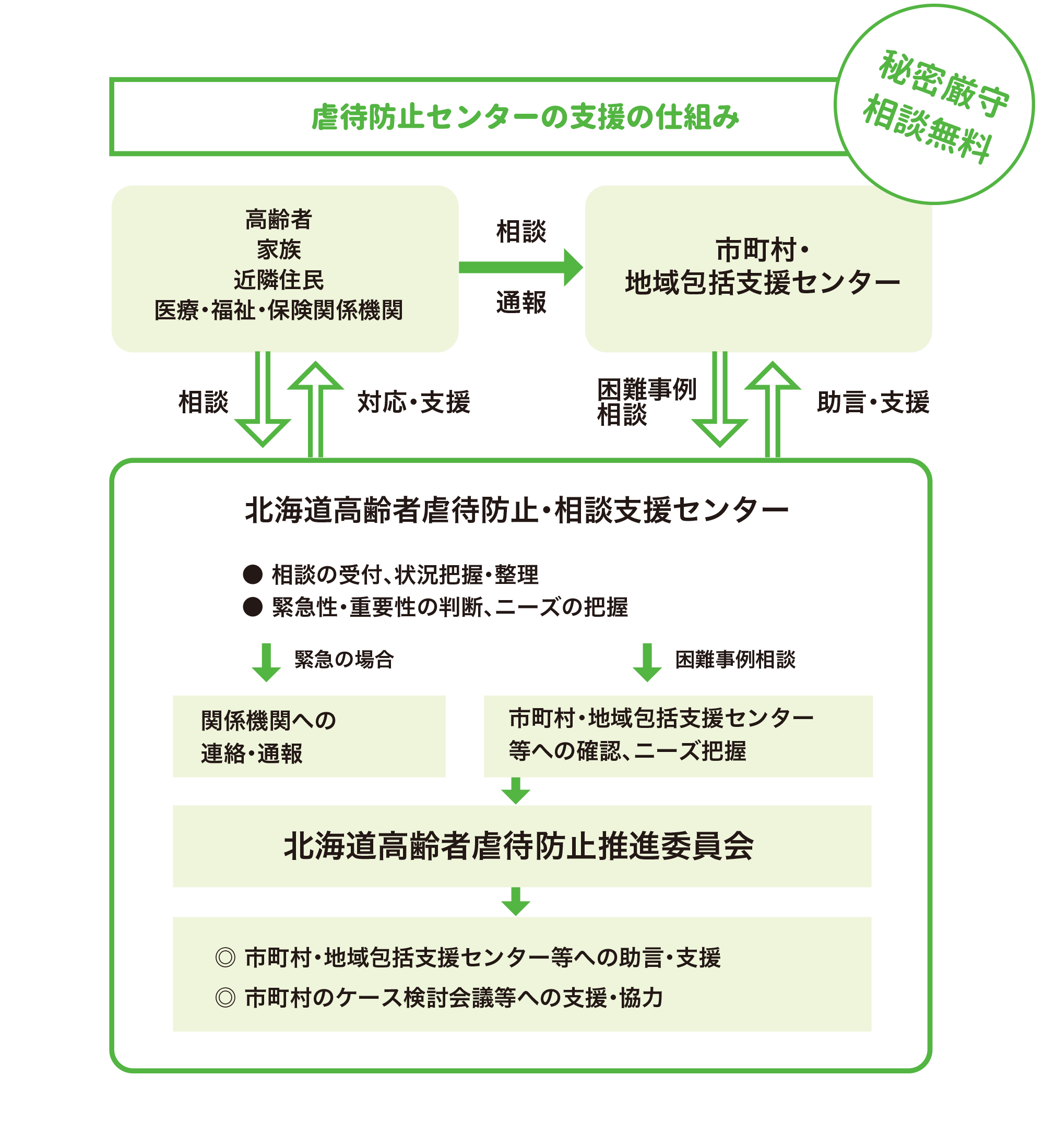 北海道高齢者虐待防止・相談支援センターは、高齢者の虐待に関する専門の相談機関です。